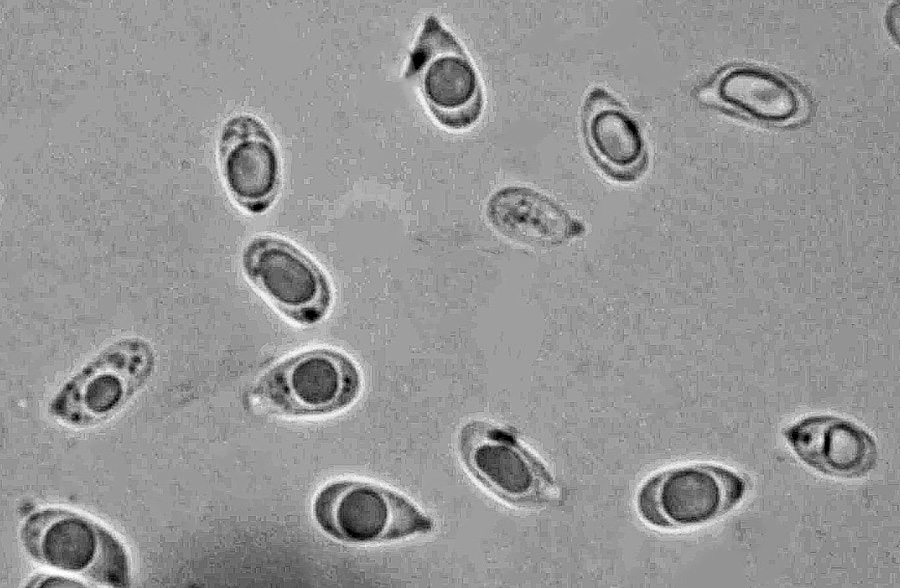 Sporen: ca. 5,8-9 x 3,2-4,5 oval, glatt, hyalin, mit Tropfen